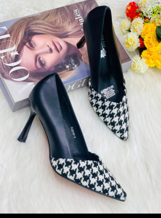 Turn heads with every step in the Houndstooth Stiletto Heels. These sleek white pumps feature a striking pointed toe wrapped in classic black and white houndstooth, blending timeless sophistication with runway-ready flair. The slender stiletto heel elongates your silhouette, making them the perfect choice for power moves and polished evenings.